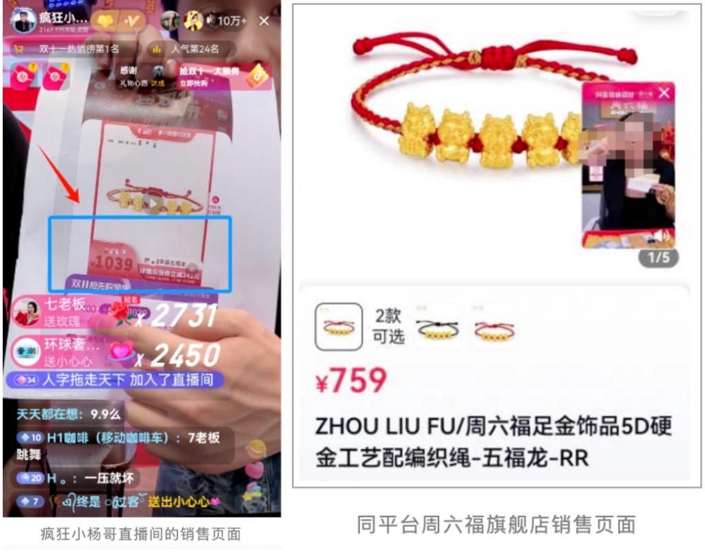 11 月 4 日,记者在短视频平台 " 疯狂小杨哥 " 直播间看到,售价为 669 元的周六福五福龙足金手串,主播称在同平台其他主播直播间售价为 1039 元,并出示了销售页面截图。而记者随后在同平台周六福官方旗舰店发现其售价为 759 元。