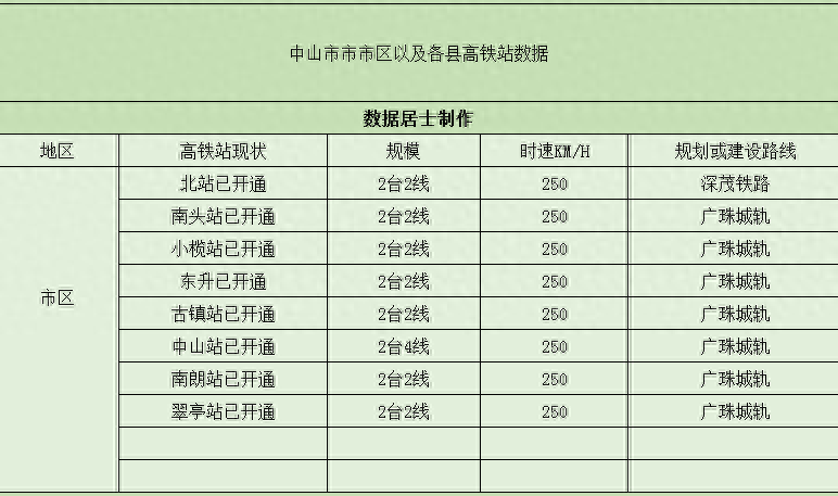 中山市下辖按照镇来算的,目标是在辖区内建设8个高铁城际站,截止目前为止这八个高铁城际站都已经开通使用了,完成率百分之百,是其他地级市的榜样,中山市开通的八个高铁城轨站都是位于省内重要城际线广珠城际和深茂铁路二条铁路线上的站点。