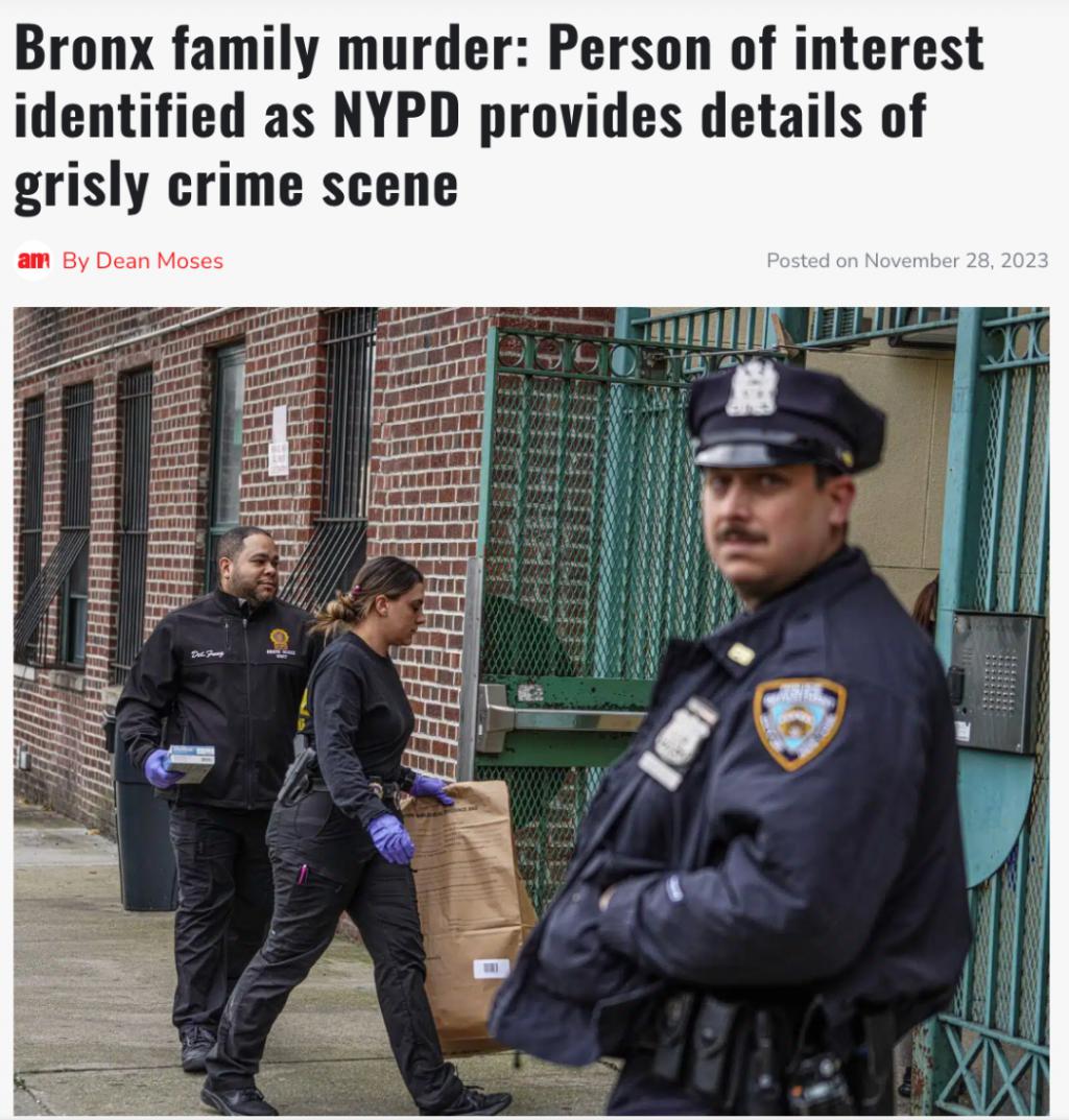 据纽约华人资讯网综合 Amny、纽约邮报报道 警方周二表示,他们已确认一名与周日布朗克斯家庭谋杀案有关的嫌疑人。