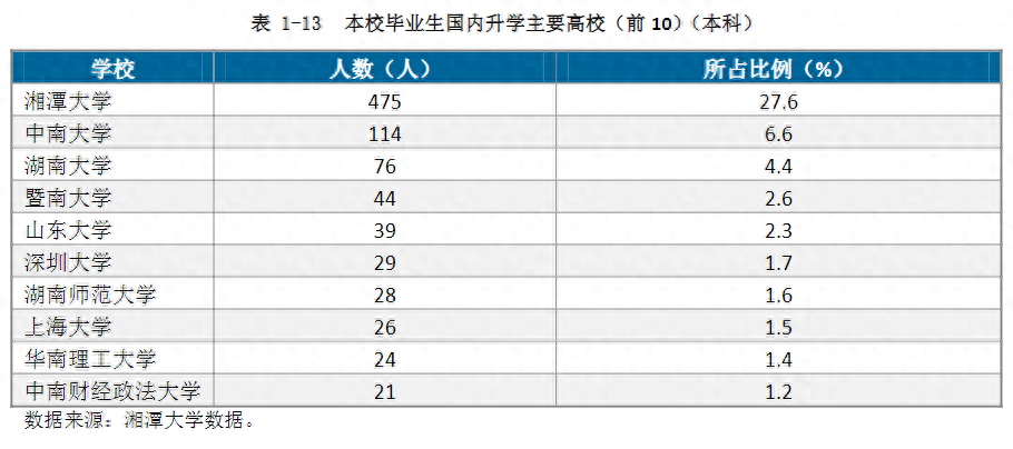 2021届本科毕业生的升学深造率为31.1%。有27.6%在湘潭大学继续读研,其次是中南大学(6.6%)、湖南大学(4.4%)等。见下图:
