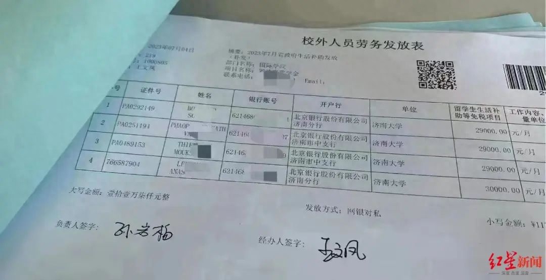 网传的表格截图显示,济南大学对4名外国留学生发放7月高额“生活补助”,每人领到的钱高达30000元。