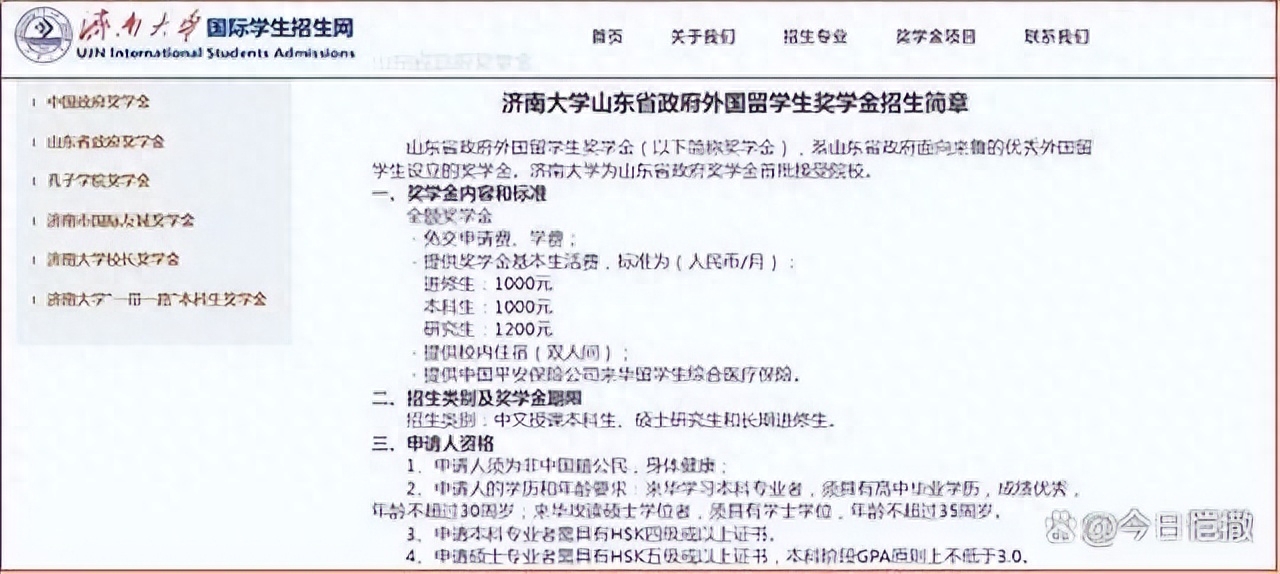 据济南大学对外国留学生的招生简章,只要有一张简单的证书,高中毕业、不超过30岁,就能申请优厚的留学待遇:免学费、住宿费,提供每月1000元补助,连保险费都给报销,算下来一毛钱不花,一年还能轻松进账2-3万,比一般打工都赚钱。