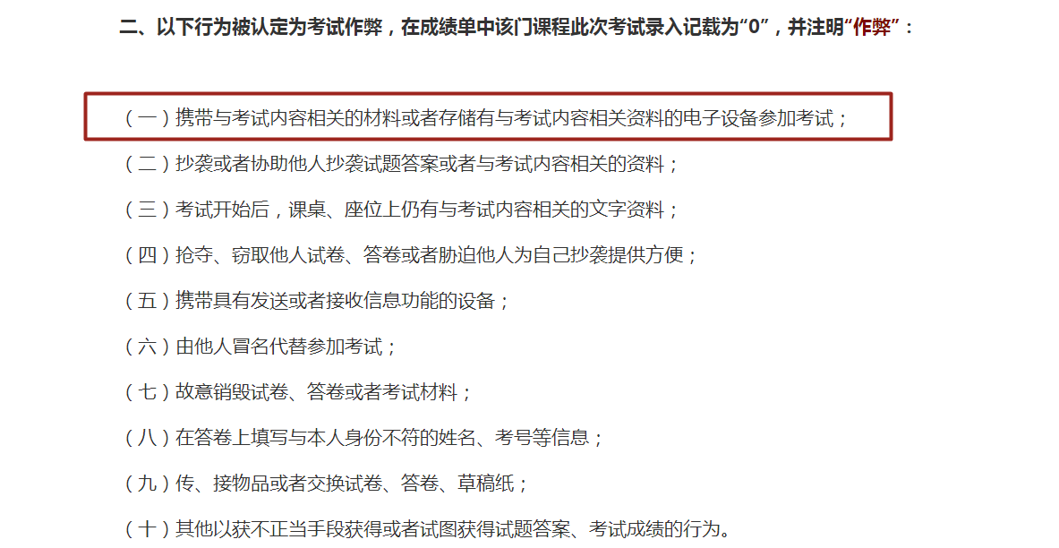 其第一条就是:携带与考试内容相关的材料或者存储有与考试内容相关资料的电子设备参加考试。