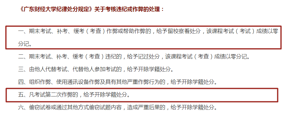 那么,我们下面就去看看广东财经大学在这份学生作弊处罚通告中,提到的两个处罚依据中针对“学校考试作弊”的处罚,是如何规定的。