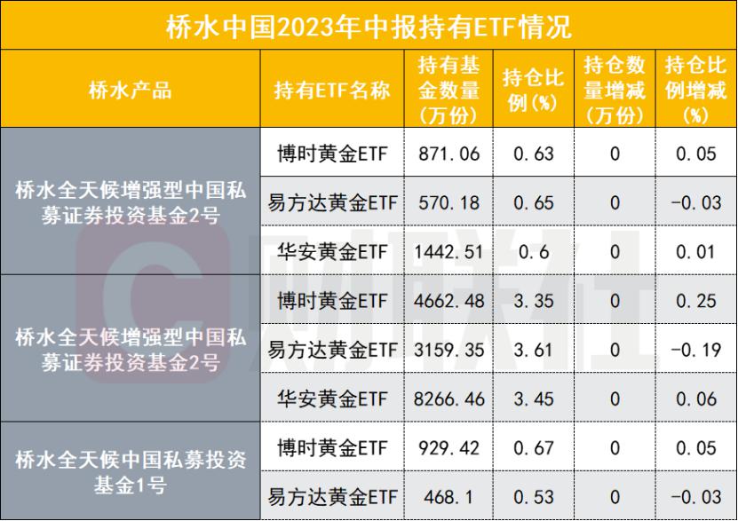 其中,华安黄金 ETF 中报显示,桥水全天候增强型中国私募基金 3 号、桥水全天候增强型中国私募基金 2 号位列该 ETF 的前十大持有人,合计持 9708.97 万份,与 2022 年底持平;桥水全天候增强中国私募投资基金 1 号、桥水全天候增强中国私募投资基金 2 号、桥水全天候增强中国私募投资基金的 3 号,也在 6 月底现身易方达黄金 ETF 的前十大持有人行列,合计持有 4197.63 万份,与 2022 年底持平;同期,桥水中国旗下产品持有博时黄金 ETF6462.96 万份,与 2022 年底持平。