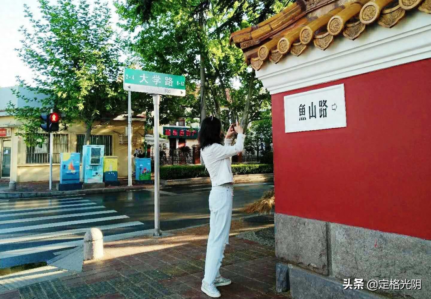 特别是中国海洋大学外的鱼山路与大学路交界的拐角更成了外地来青游客的必打卡之地,妥妥地成了一面网红墙。常常围着三四圈人,有序地摆拍,更有一对对照婚纱照的新人在此辛苦地等待取景。