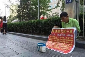 他手拿的横幅上写道,“每拳10元,好心人,您就打我一拳吧”。但是截至目前,并没有人打他,更多的是10元、20元的捐款。