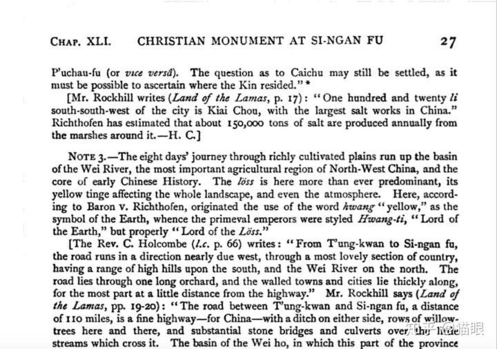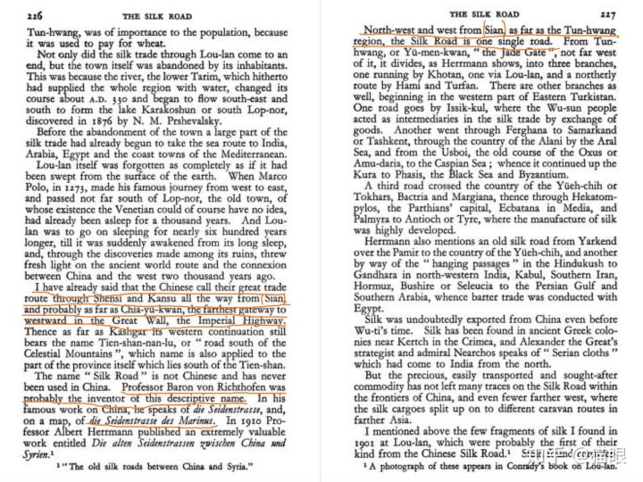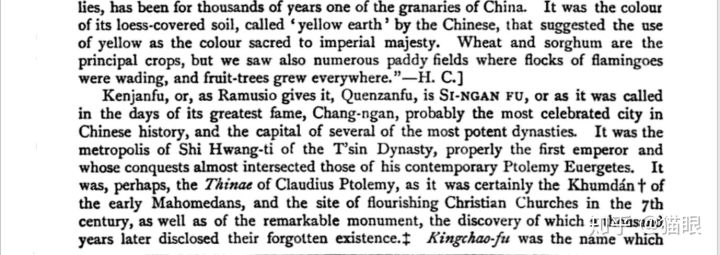 譬如Henry Yule在【Travels of Marco Polo】第27页提到西安很有可能是Ptolemy笔下的Thinae,并引用了李希霍芬与Rockhill对从西安府至敦煌的道路的认可“the highway for China”。