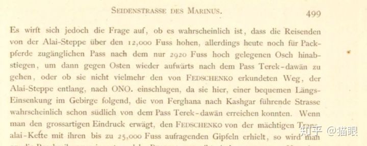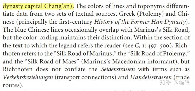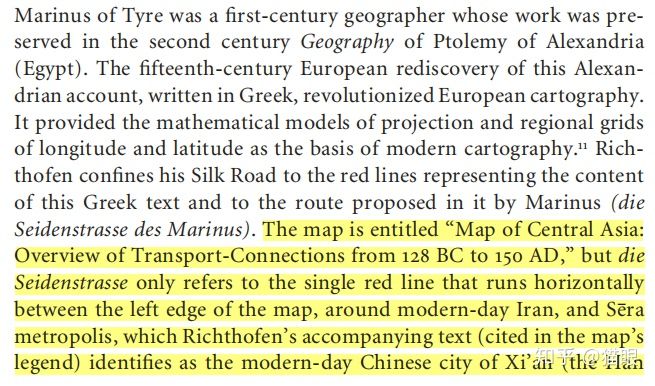 李希霍芬第一次提出Seidenstrasse一词在原作499页,标题中明确表明对这一词的阐述来自马里努斯(Marinus),我前文引用芝加哥大学学报论文已经述及此事:“Richthofen confines his Silk Road to the red lines