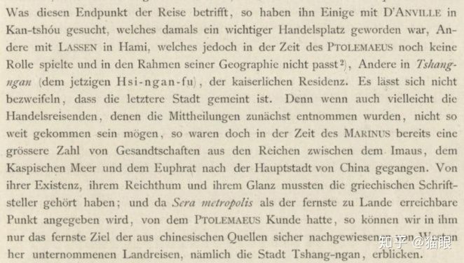 文首提到的李希霍芬原作对这个问题有精彩的阐述。他首先摆出了关于丝路(Seidenstrasse)终点赛拉大都市(Sera metroplis)具体所指的三种观点。D’Anville认为是Kan-tshou,应该在甘肃省河西地区;Lassen认为是Hami,即今新疆哈密;另一部分人认为是帝国天子居处长安(Tshang-ngan der kaiserlichen Residenz)。李希霍芬赞成第三种说法,他认为Sera metroplis毫无疑问是长安,并表示那时的商旅不可能没听说过长安这样的城市以及其财富与荣耀,同时,他也参考了中国史书,确定了这个说法。