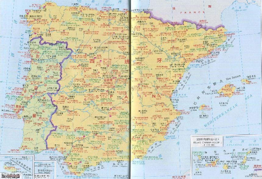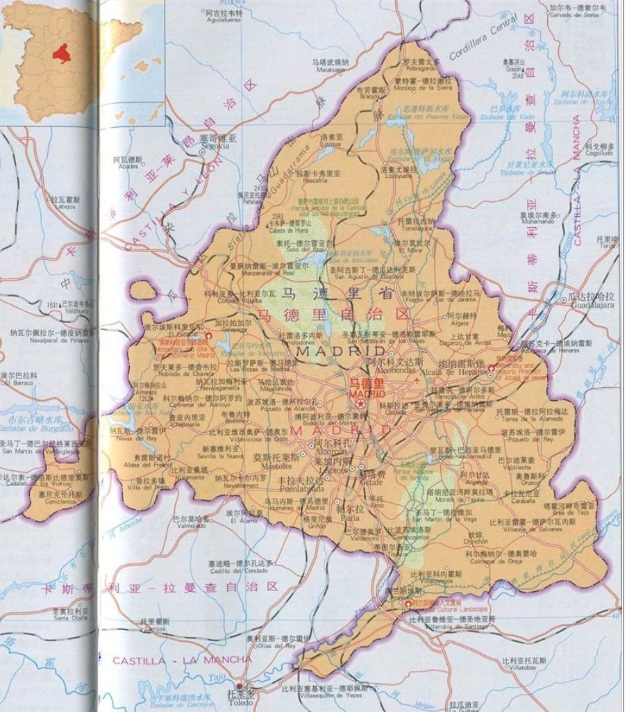 西班牙:南欧国家。位于伊比利亚半岛上,陆疆同 葡萄牙、安道尔、法国接壤,北临比斯开湾,东、南滨地中 海、大西洋,隔直布罗陀海峡同北非摩洛哥相望。面积505925 平方公里。人口4735万,西班牙语为国语。首都马德 里。中部为梅塞塔高原,北部有坎塔布连山脉和比利牛斯山脉,南部有摩勒纳山脉和安达卢西亚山脉。北部气候温和湿 润,中部、南部比较干燥。汞矿储量占世界首位,并有煤、铁、 铝土、铜、黄铁矿。