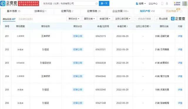 企查查 APP 显示,此前东方甄选关联公司东方优选(北京)科技有限公司申请注册多个东方臻选直播间主播肖像商标,包括 " 董宇辉、孙佳琦、孙楚涵 " 等人肖像。国际分类包含教育娱乐、广告销售、农林生鲜、办公用品等,目前商标进度为:注册申请中。公司还申请注册了 " 方脸哥、董宇辉、东方臻选 " 等文字商标,商标状态仍为申请注册中。