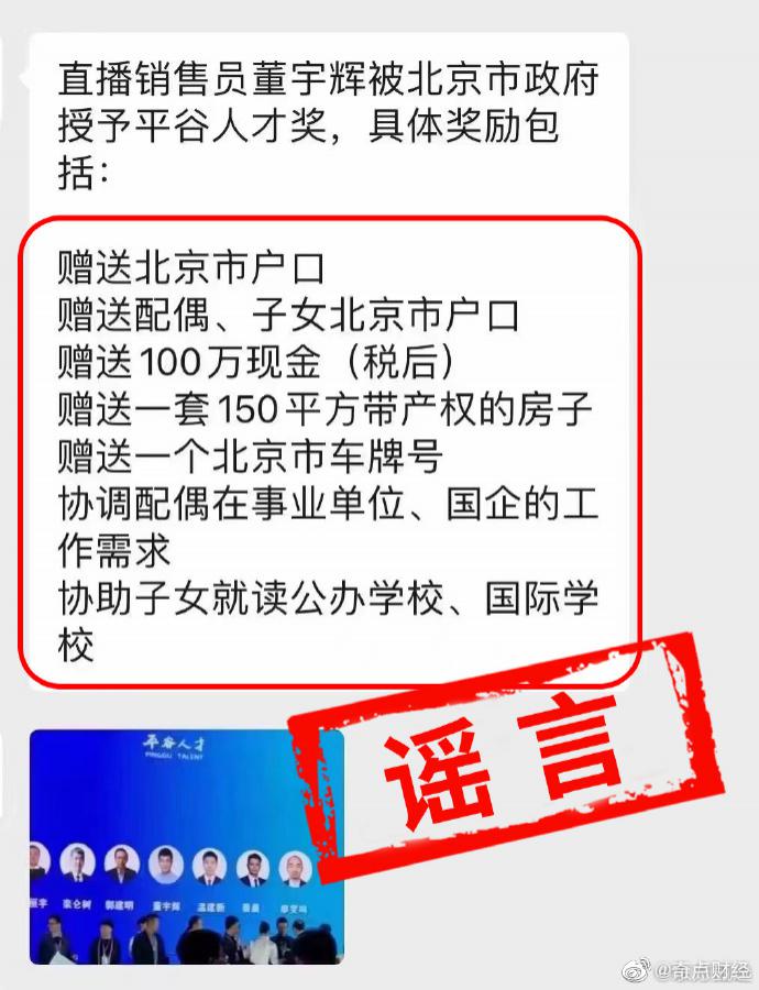 随后,关于平谷将赠送董宇辉北京市户口,赠送配偶、子女北京市户口,赠送 100 万现金 ( 税后 ) ,赠送一套 150 平方米带产权的房子和一个北京市车牌号,协调配偶在事业单位、国企的工作需求,协助子女就读公办学校、国际学校等消息在网上流传。2 月 17 日,记者从平谷区证实,网传消息不实。