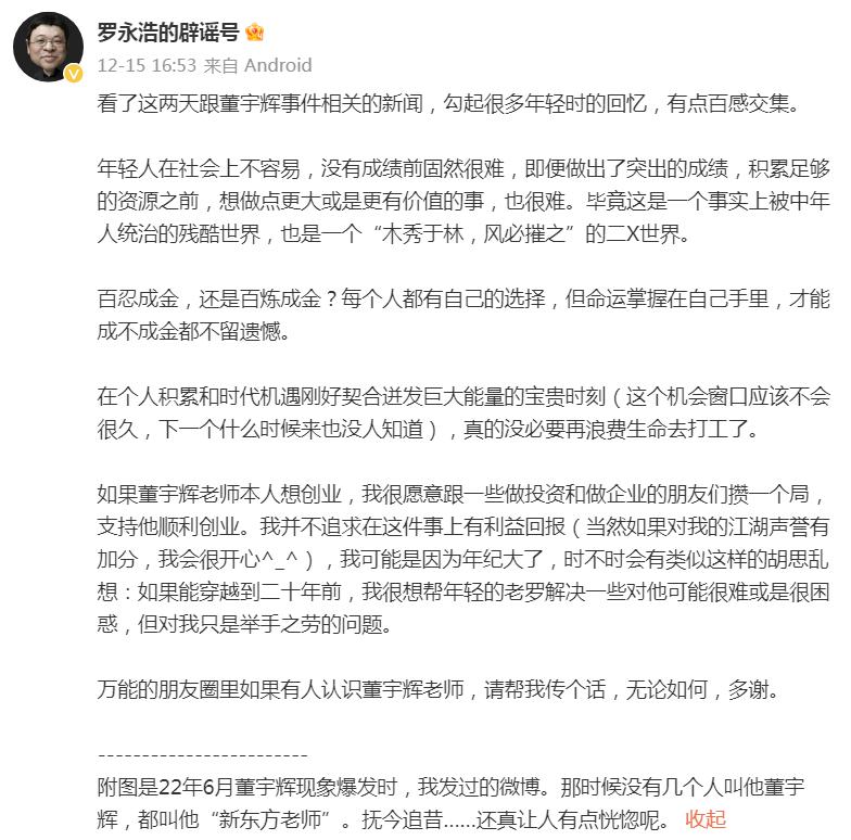 15 日,罗永浩发文表示," 如果董宇辉本人想创业,我很愿意跟一些做投资和做企业的朋友们攒一个局,支持他顺利创业。"