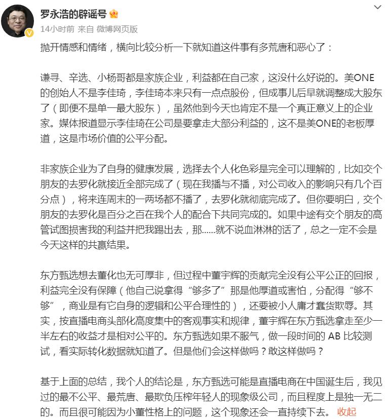随后,罗永浩又发文称,按直播电商头部化高度集中的客观事实和规律,董宇辉在东方甄选拿走至少一半左右的收益才是相对公平的。