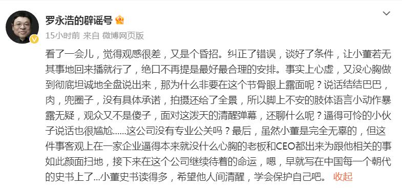 16 日晚,罗永浩通过微博 @罗永浩的辟谣号 发文称:" 看了一会儿,觉得观感很差,又是个昏招。"