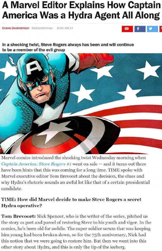 而在今日(5月26号)早晨,漫威高级副总裁Tom Brevoort甚至证实美国队长的真实身份,竟然就是为九头蛇效力的卧底特工!! 不但他是特工,连他妈也是特工!主创透露史蒂夫的母亲就曾被九头蛇招募过,美国队长这个身份只是帮他掩盖九头蛇身份的幌子,现在他将正式“回归”九头蛇,这还只是未来计划的冰山一角,会有更大的“转变”等着粉丝们,而这种可能会彻底黑化美队的剧情走向,也让很多外国粉丝表示接受不能。