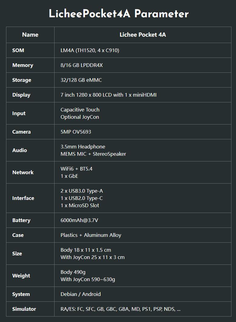 Lichee Pocket 4A 将支持 Android 和 Debian Linux 操作系统,目前官网已经上线介绍信息,但没有价格,IT 之家附参数表: