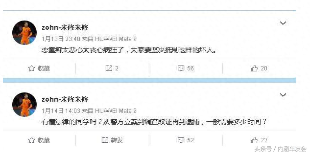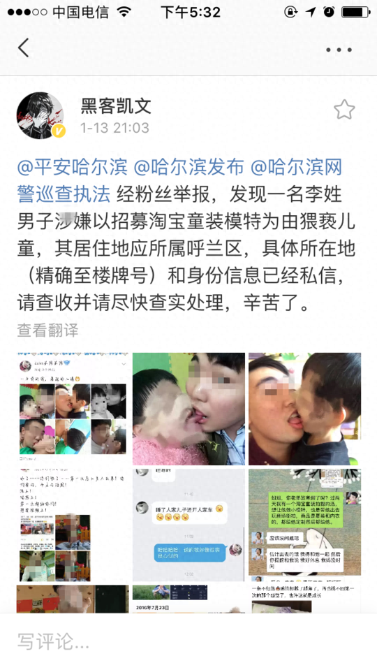 1月在13的晚上,网友“黑客凯文”发布微博粉丝举报信息,哈尔滨一名男子因招募儿童模特而涉嫌猥亵儿童。消息公布之后,引起了不少网友的激烈讨论,1月14日,哈尔滨警方称已经收到报警信息,对此事正在调查中。从原来曝光的截图来看,“Zohn米修米修”不仅是一个摄影博主,还是一个大V。而在他关注的30个微博里,有“男孩足模”、“正太童萌”等,里面充斥的内容估计大家都能想到。但就在被曝是个无耻的恋童癖后,他在微博的发言却显得与早前的言行迥然不同。