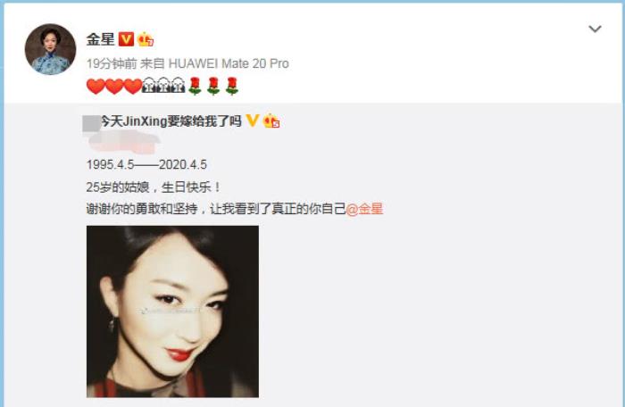 看了某网友给金星的祝福:“1995.4.5——2020.4.5 25岁的姑娘,生日快乐!谢谢你的勇敢和坚持,让我看到了真正的你自己@金星 ”。