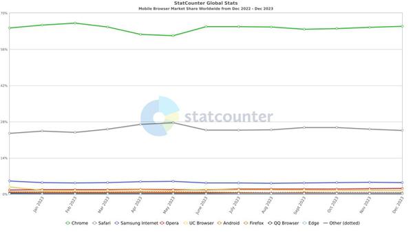 Google Chrome 仍然是大多数台式电脑用户的首选浏览器。它的市场份额高达 65.23%,在 2023 年 12 月增加了 3.17%。