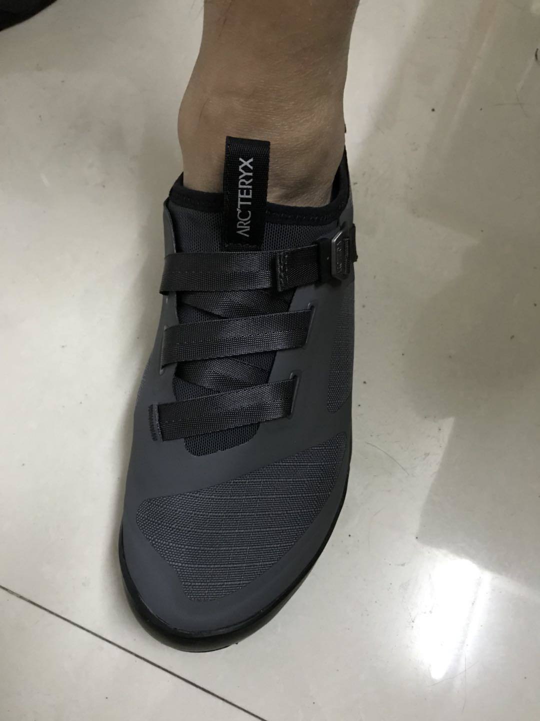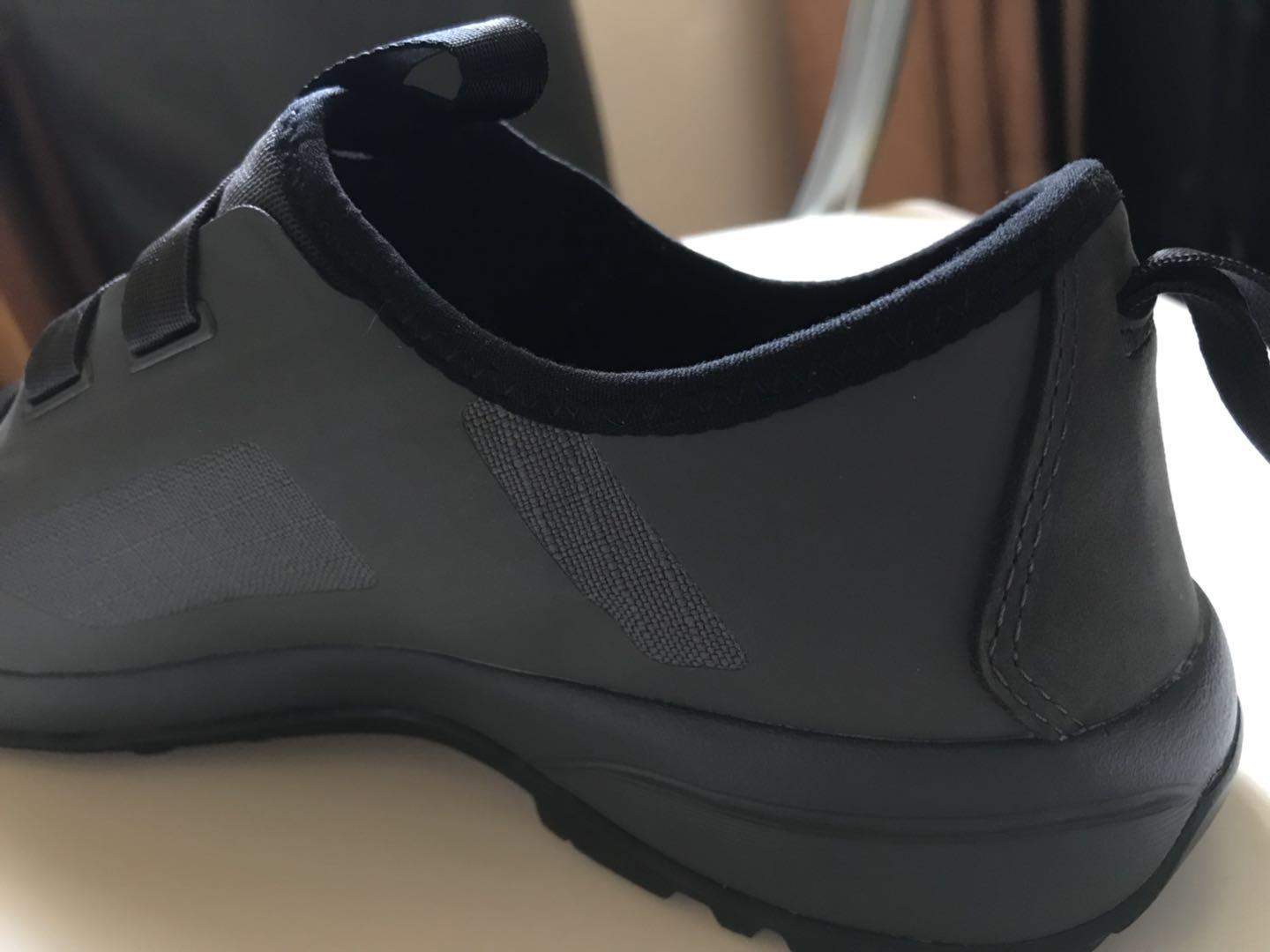 鞋子总体颜值中规中矩,鞋头的不规则透气孔和鞋面的单手快速系带系统设计也很人性化. 鞋子内部的鞋垫是皮革的,透气又贴肤.穿着和舒适. 鞋头和鞋后跟处都是一体式防滑橡胶设计,重量300g不到,既轻盈又防滑,能有效的保护整个脚掌的安全. 整体而言,彰显了始祖鸟的做工精湛和人性化.另外不得不提一下折叠式鞋跟的设计实在是太方便了.对于我这种懒人而言,回家不想换鞋了,直接折叠后跟就可以当拖鞋来用了