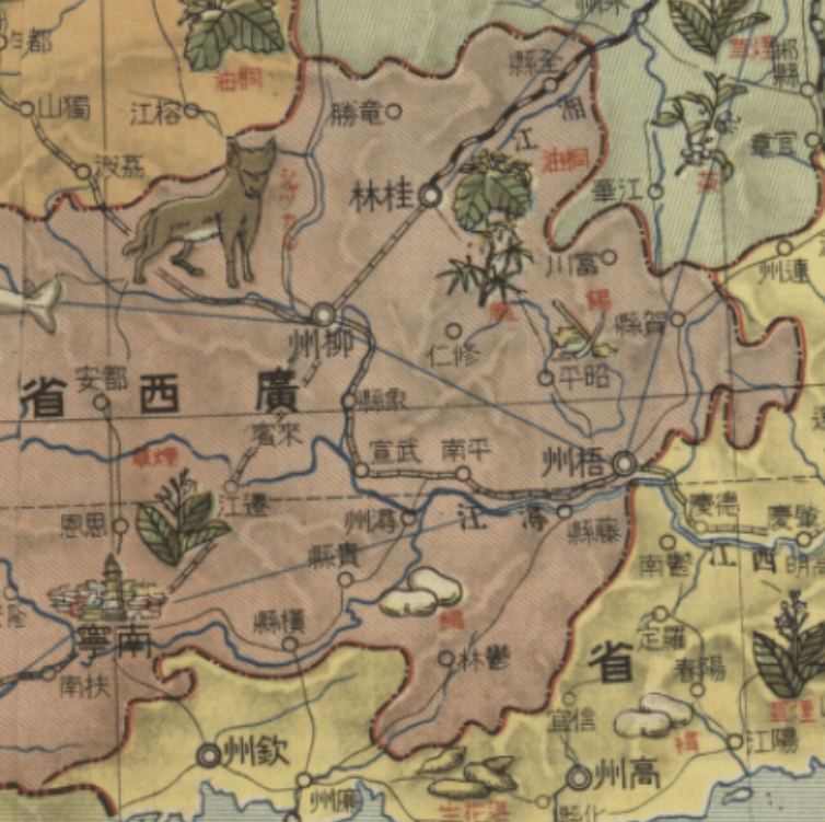 看一下1939年出版的地图,广西的大城市只有六个:南宁、柳州、桂林、梧州、百色、龙州。当时,钦州、北海、防城港还属于广东省管辖。