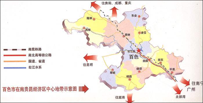 百色市地处贵州省、云南省、广西的中心位置,地理位置非常重要。