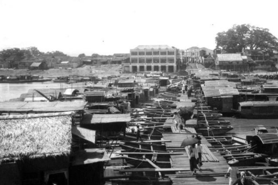 上图为1930年的梧州船桥。渔船排列在木桥两侧。