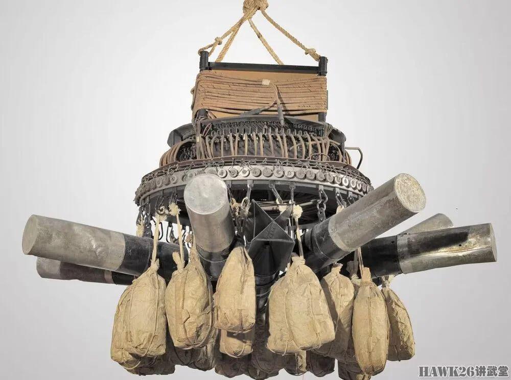 美国博物馆收藏的日本 " 气球炸弹 " 有效载荷。顶部的盒子内是一个气压控制器,它可以保持适合的飞行高度,将气球高度降低时,将会自动抛弃底部的几个沙袋。沙袋上方是几枚银色头部的燃烧弹和一枚带有尾翼的高爆炸弹。