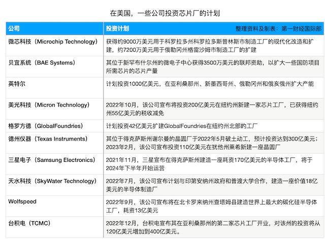 其中,单项最大的投资是台积电(TSMC)宣布在亚利桑那州投资 400 亿美元新建两座芯片厂。德州仪器(Texas Instruments)则计划在得克萨斯州投资 300 亿美元新建四座芯片厂,并用 60 亿美元扩建原有厂地,并在犹他州投入 110 亿美元新建新厂。英特尔在分别计划在亚利桑那州和俄亥俄州各花费 200 亿美元新建两座芯片厂,并在新墨西哥州和俄勒冈州扩建现在的芯片产能。