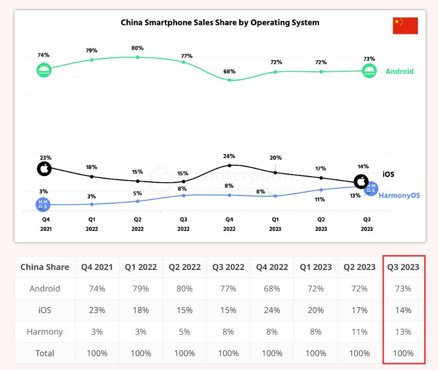 鸿蒙 OS 正式推出于 2019 年 8 月。从各类机构的统计来看,近几年鸿蒙生态在中国市场已取得明显进展。根据 Counterpoint 发布的数据,2022 年初的时候,鸿蒙 OS 在国内手机市场的占比只有 3%,到 2022 年底增长到 8%,而到 2023 年末,再度提升到 13%,仅落后苹果 iOS 一个百分点。同时期,安卓的份额从 79% 掉到 73%,iOS 从 18% 下滑到 14%。