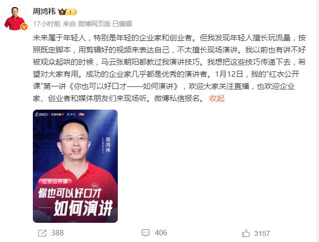 事后,周鸿祎在微博回应此次事件," 未来属于年轻人,特别是年轻的企业家和创业者。但我发现年轻人擅长玩流量,按照既定脚本,用剪辑好的视频来表达自己,不太擅长现场演讲。" 并预告自己将在 1 月 12 日做一场教演讲的直播。