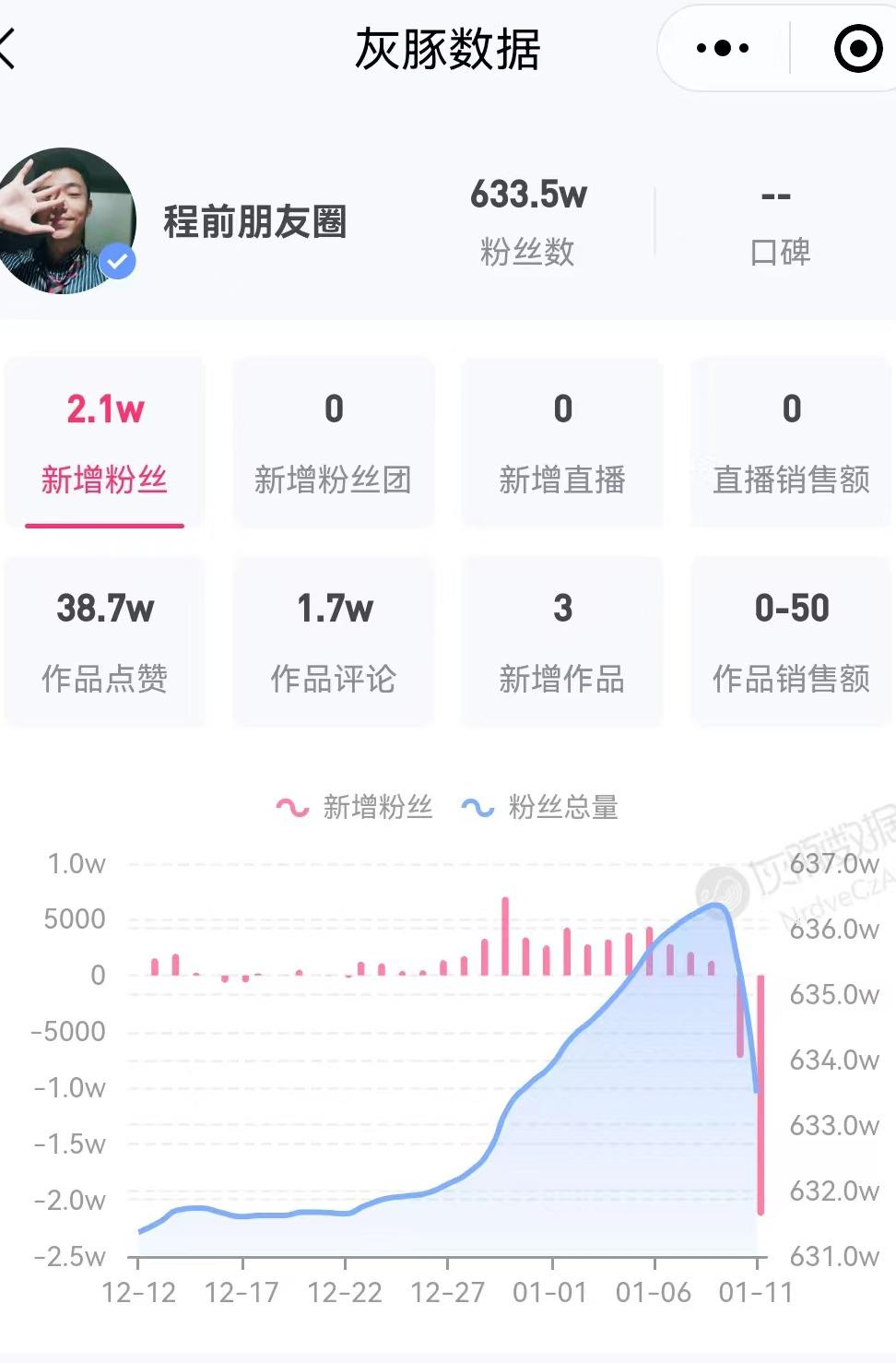 1 月 10 日深夜,程前在个人账号发布道歉视频,风波发酵几天," 程前朋友圈 " 持续掉粉,目前粉丝为 633.5 万。