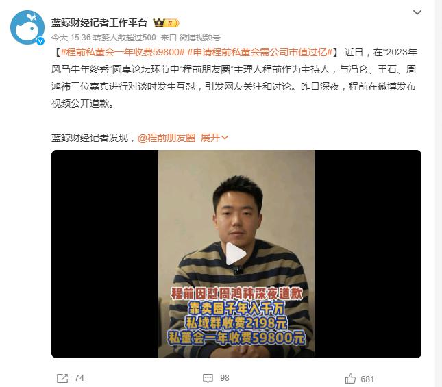 据蓝鲸财经报道,程前的商业变现模式大概分为三块。首先是内容广告费和项目合作费,第二个变现模式就是社群会员,第三个变现模式就是私董会,也就是社群会员的进阶版本。私董会的价格一年收费 59800 元,主要目标是高端商业人士,可以和程前 1 对 1 对谈,聊得好的可以给对方做 IP 定位、商业策划等内容。