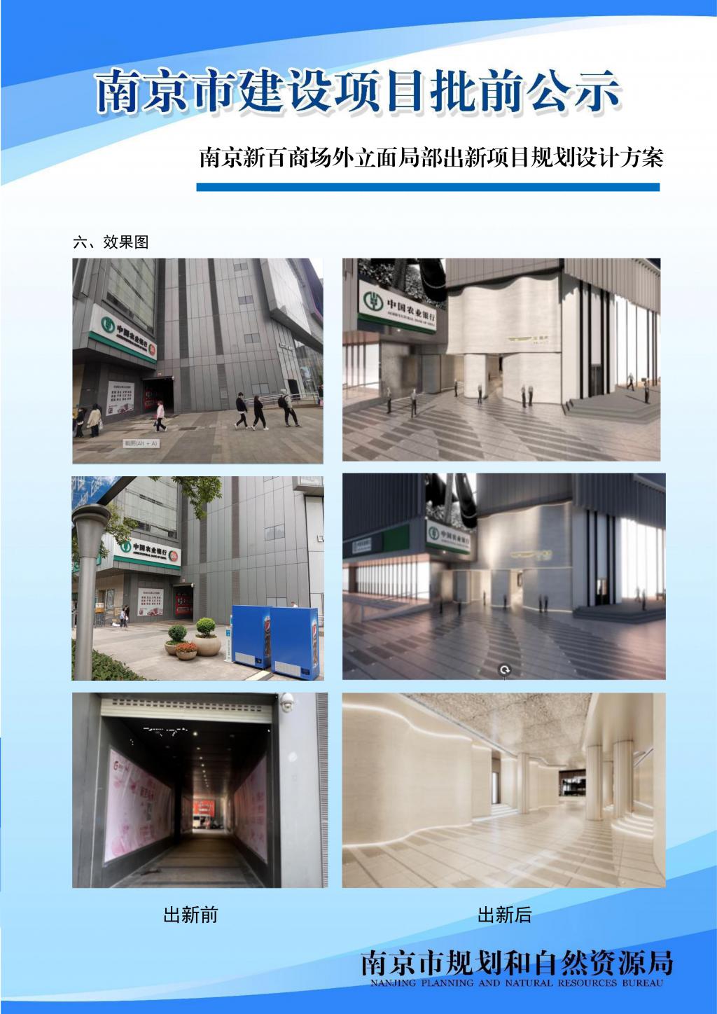2023 年 8 月 18 日,南京市规划和自然资源局发布南京新百商场外立面局部出新项目规划设计方案批前公示,对 A 座一层现消防通道及北侧出入口区域外立面进行出新。公示中提到,为提升新街口中心商圈城市形象,结合使用需求,经专家评审会(含消防)修改完善后,将在不改变建筑高度,不新增建筑面积,不影响原消防通道使用功能前提下,对 A 座一层现消防通道及北侧出入口区域外立面进行出新。