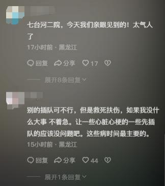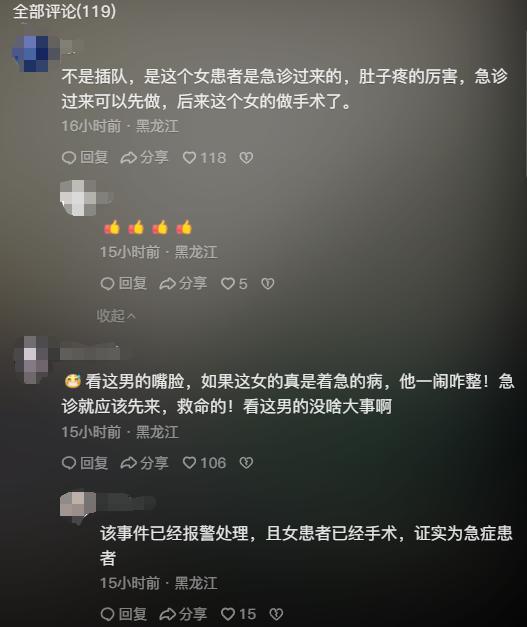 评论区中有网友表示自己事发时也在现场。还有网友称 " 不是插队,是这个女患者是急诊过来的,肚子疼得厉害,急诊过来可以先做,后来这个女的做手术了。"" 该事件已经报警处理,且女患者已经手术,证实为急症患者。"