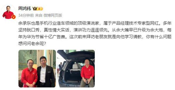 【CNMO 新闻】近日,网上关于 360 集团创始人、董事长周鸿祎的声音不少。1 月 18 日,周鸿祎突然 cue 到华为常务董事、终端 BG CEO、智能汽车解决方案 BU 董事长余承东。周鸿祎称,余承东也是手机行业造车领域的顶级演说家,每年为华为节省十亿广告费。