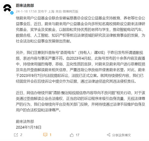 快科技 1 月 18 日消息,蔚来法务部今日发文称:他们注意到抖音账号 " 森哥电车 "(持有人:谭 X 成)于昨日发布所谓道歉视频,表述内容与事实严重不符。