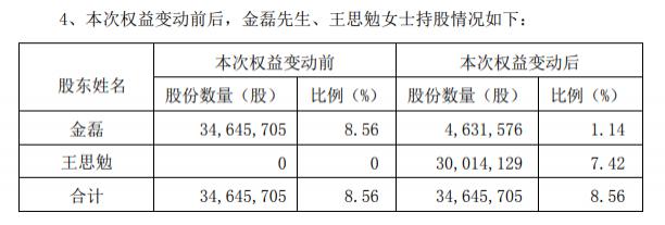 本次权益变动后,金磊持有公司 463.15 万股股份,约占公司总股本 1.14%,不再是公司持股 5% 以上股东;王思勉持有公司 3001.41 万股股份,约占公司总股本 7.42%,成为公司持股 5% 以上股东。