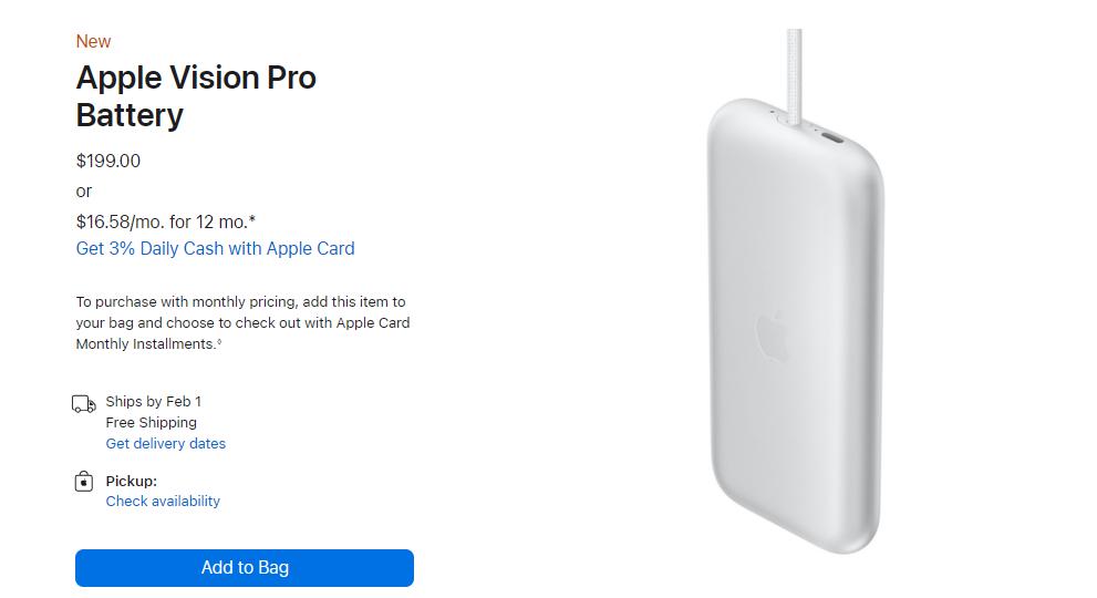 Apple Vision Pro 电池售价 199 美元,使用 USB-C 编织线缆连接到 Apple Vision Pro。它可以放入口袋中作为便携式电源,并支持 2 小时的常规使用、2.5 小时的视频播放,插入电源后全天使用。