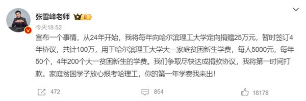 张雪峰向哈理工捐款100万:每年50位贫困生 一人5000元