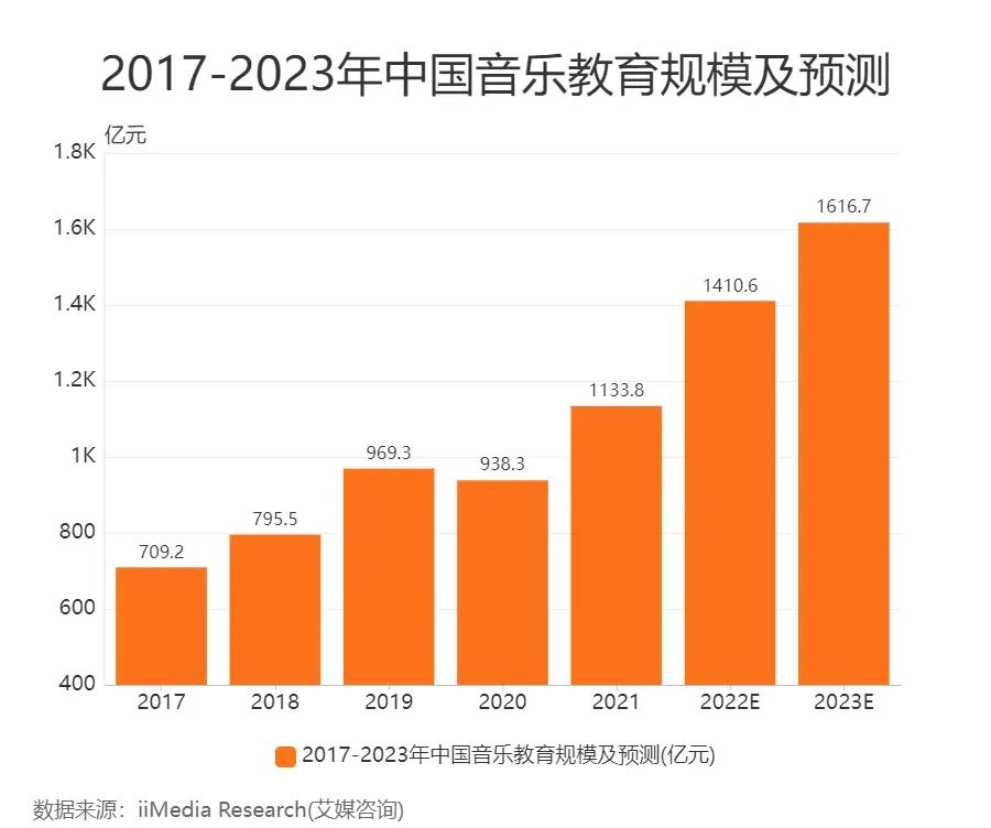 2017-2023 年中国音乐教育市场规模及预测 数据来源:艾媒咨询