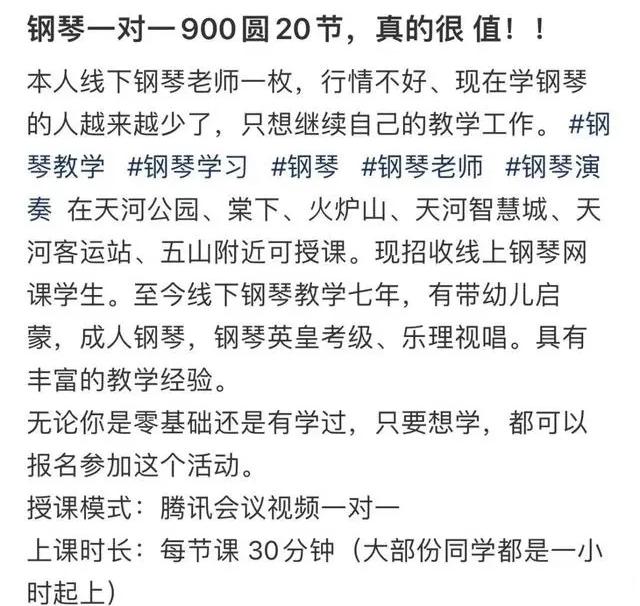 有的钢琴老师在小红书上发布的线上一对一教学,20 节课也只需要 900 元。