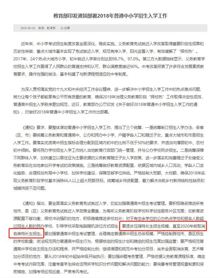 2018 年,国家教育部发布《关于做好 2018 年普通中小学招生入学工作的通知》,明确提到,要逐步压缩特长生招生规模,直至 2020 年前取消。