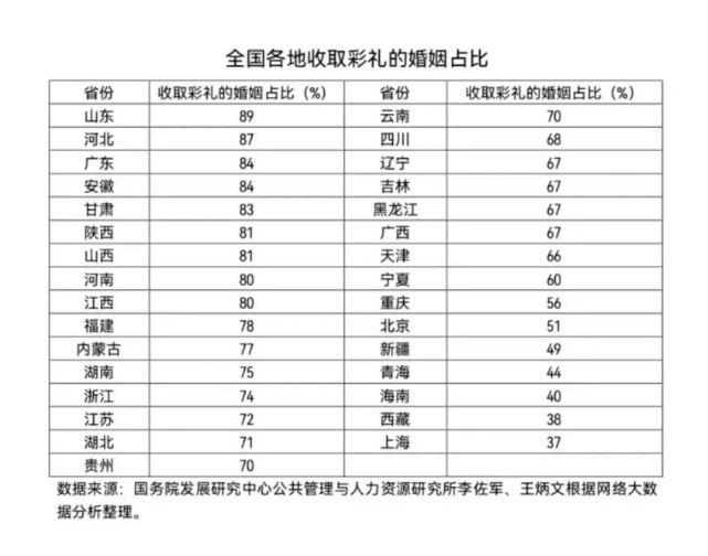 事实上,收取彩礼是全国性现象。据《中国经济时报》,国务院发展研究中心公共管理与人力资源研究所副所长李佐军采用大数据方法对 " 高价彩礼 " 现象进行研究。大数据分析显示,2000 年以来,全国约有超过 79% 的婚姻收取彩礼。