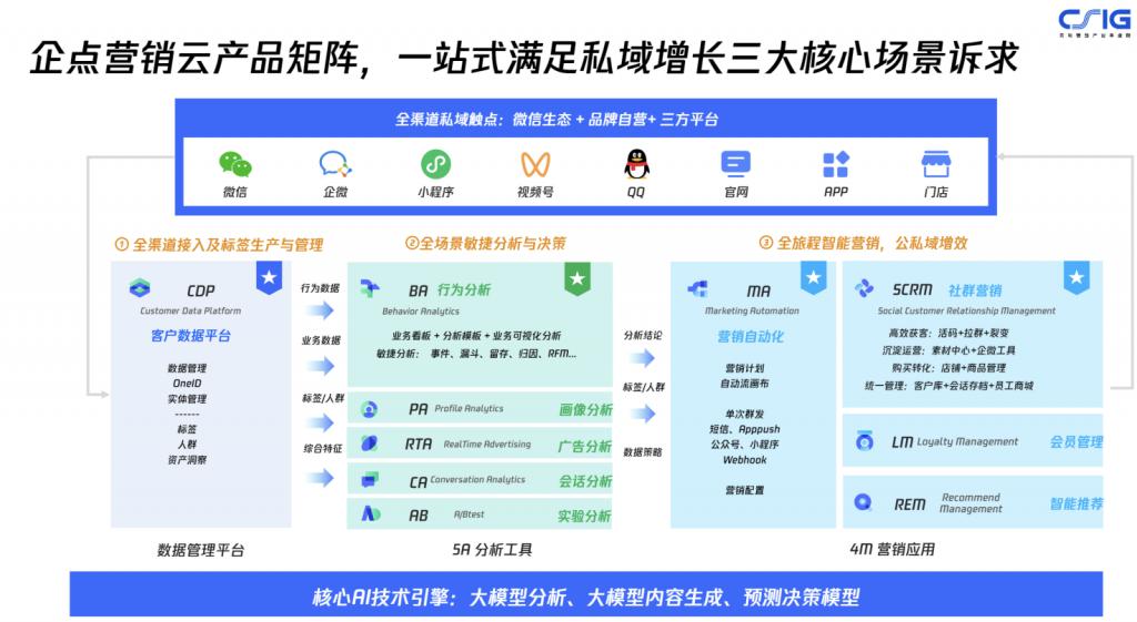 在 2024 腾讯产业合作伙伴大会期间,腾讯企点对外公布了基于大模型 AI 实践全新升级的智能化产品矩阵,推出企点营销云服务,覆盖 B2C、B2B 业务场景,强化智能私域营销。