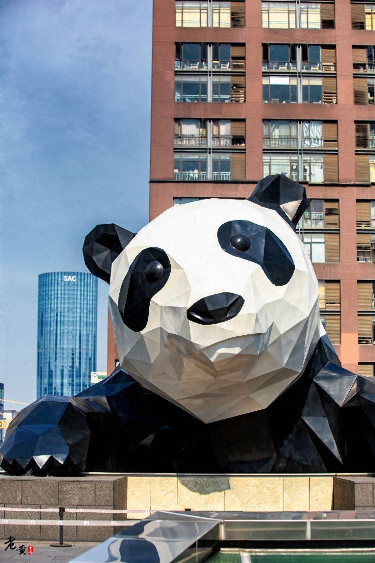 成都国际金融中心,简称成都IFS。位于成都市锦江区红星路和大慈寺路交汇处,紧邻著名的春熙路,是绝对的黄金地段。IFS是由四座塔楼及裙楼组成,核心的1,2号塔楼高度为248米,各有50层。然而不管在本地人眼里,还是游客们的印象中,IFS最高光的logo并不是在这些楼宇之中,而是一只调皮的大熊猫。没错,就是那只爬在楼顶上,半个身子还挂在楼外的大熊猫,它才是IFS,甚至整个成都商圈最知名的地标。