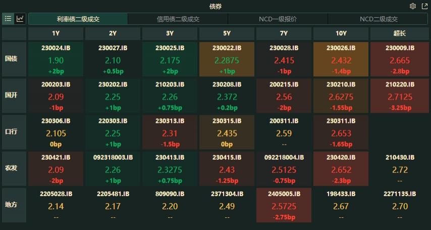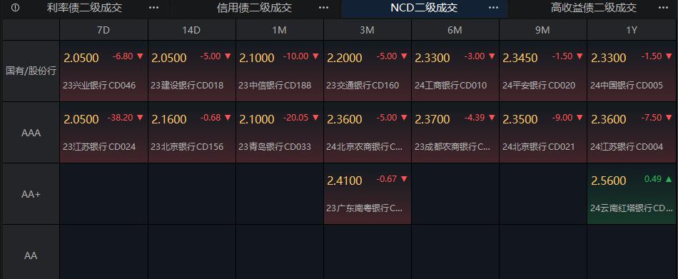 存单方面,今日 3M 期国股在 2.1%-2.36% 位置需求较好,较上一日下降 5bp,1Y 期国股报在 2.32%-2.36% 的位置,较前一日下行 1.5bp。AAA 级存单方面,9M 成交在 2.35%,1Y 成交在 2.36% 的位置。