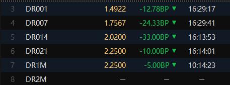 银行间回购利率全线下行。
